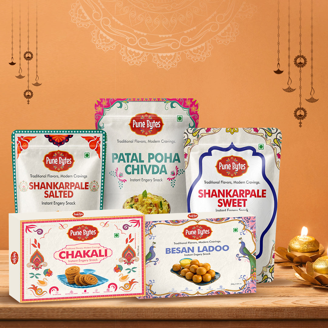 Bring home the authentic taste of Pune with our Puneri Delight Combo, a handpicked collection of traditional snacks and sweets that celebrate every occasion with flavor and joy. π¬β¨ From the melt-in-your-mouth Besan Ladoo to the crispy and light Chivda, every bite is a reminder of homely love and tradition. The golden, crunchy Sweet Shankarpale add a festive sweetness, while the perfectly seasoned Salted Shankarpale balance the flavors with their savory crunch. No Maharashtrian festive platter is complete without the classic Chakli, rich in taste and texture. Crafted with care using age-old recipes and premium ingredients, this combo is perfect for gifting, celebrating, or simply relishing at tea-time with family. Whether itβs Diwali, a family get-together, or your everyday indulgence, Punebytes brings you the true essence of Maharashtrian flavors. A perfect harmony of sweet and savory, packed with tradition and love.